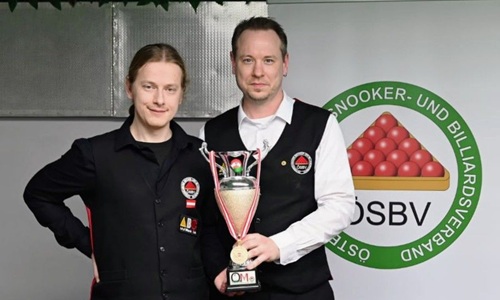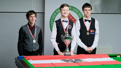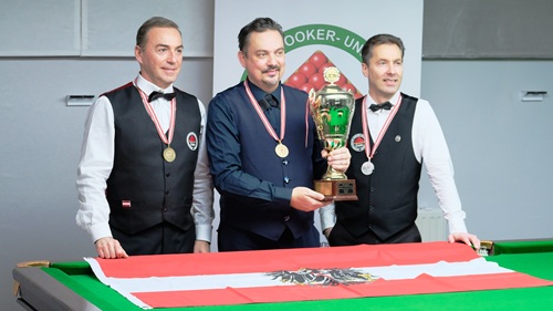 ...ÖM Masters 2025: 3. Garry Balter, 1. Hans Nirnberger, 2. Christian Hochmayer [Foto: ÖBU/Andreas Kronlachner]... DOPPEL: Keine Chance hatten Daniel und Thomas bei ihrem 0:3 im Halbfinale gegen Oskar Charlesworth / Philipp Koch (HSEBC). Im Spiel um Platz 3 gegen Christian Kasparek / Zoran Kostic (HSEBC) folgte dann jedoch ein 2:0, auch dank einer 25er-Clearance von Daniel im zweiten Frame. Im Finale mussten sich Oskar und Philipp gegen Thomas Janzso (HSEBC) / Jérôme Liedtke (Snock) deutlich 0:3 geschlagen geben. Hier war Oskars 78 aus dem Halbfinale gegen Daniel und Thomas das höchste Break.