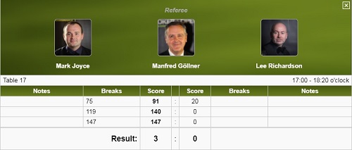 VIENNA SNOOKER OPEN 2019: Mark Joyce erzielt 147 und alle Österreicher ausgeschieden am Tag 3Das VIENNA SNOOKER OPEN hat bereits zum zweiten Jahr in Folge ein Maximumbreak verzeichnen können. War's 2018 Tom Ford, der das perfekte Break von 147 Punkten spielte, am Samstag (11. 5.) gelang Mark Joyce dieses Kunststück. In seinem mit 3:0 gewonnenen und vom 15-Reds-Mitglied Manfred Göllner geleiteten Achtelfinale gegen Lee Richardson erzielte Joyce Breaks von 75, 119 bzw. 147 Punkten.