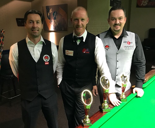 ...ASL Masters: 3. Christian Hochmayer, 1. Bernhard Müllner, 2. Hans Nirnberger... In den Halbfinali hatten sich Bernie mit 3:0 gegen Richard Kornberger (TSG) und Hans mit 3:2 gegen Christian Hochmayer (FBC) durchgesetzt, wobei Hans im Decider bereits 16-43 zurückgelegen hatte, ehe er das Match mit einer 40er-Clearance noch für sich entscheiden konnte. Im Spiel um Platz 3 hatte Christian gegen Richard mit 2:1 das bessere Ende für sich. Am Turnier nahmen, nach einer krankheitsbedingten Absage, 34 Spieler(innen) teil. Alle ERGEBNISSE sind in der ÖSBV-Online-Sportdirektion abrufbar. In der RANGLISTE nach dem zweiten Turnus bleibt Christian die Nr. 1, während Hans auf den zweiten und Bernie auf den dritten Rang kletterten. Die 15 Reds gratulieren herzlichst, und bedanken sich bei den beiden Referees Manfred Göllner und Christian Fock! ASL: Nennschlüsse für Grand Prix (Graz) und Challenge Ost (HSEBC)