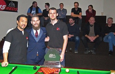 ...ASL Masters: Turniersieger Christian Hochmayer, Finalist Bernhard Müllner... In den Halbfinali hatten sich Christian gegen Hans Nirnberger (HSEBC) mit 3:2 sowie Bernhard gegen Richard Kornberger (TSG) mit 3:0 durchgesetzt. Den dritten Rang sicherte sich Hans mit einem 2:1 im kleinen Finale gegen Richard. Im Halbfinale hatte Hans mit einer 53 das höchste Break des Turniers erzielt. Am Turnier nahmen 33 Spieler(innen) teil. Die kompletten ERGEBNISSE sind wie gewohnt in der ÖSBV-Online-Sportdirektion abrufbar. In der MASTERS-RANGLISTE (Endstand) hat Christian 472 Punkte und Bernhard 328, während Richard (298) und Hans (292) am dritten bzw. vierten Rang klassiert sind. Die acht in der Rangliste gelb markierten Spieler (darunter vier 15-Reds-Members) sind fix für die Österreichische Meisterschaft am 27. Januar 2018 bei den Bulls in Salzburg (Nennschluss: 13. 1.) qualifiziert. Die grün markierten Spieler können teilnehmen falls ein fix Qualifizierter nicht nennt. Die 15 Reds gratulieren herzlichst! Dominik Scherübl ist unser15-Reds-Club-Weltmeister!Mit einem überzeugenden Finalsieg hat sich Dominik Scherübl im Rahmen unserer Weihnachtsfeier am Freitagabend (15. 12.) im Köö 7 den Titel 15-Reds-Club-Weltmeister geholt.