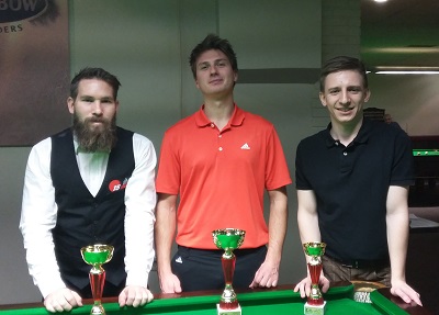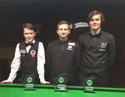...ASL Grand Prix: 2. Florian Nüßle, 1. Andreas Ploner, 3. Oskar Charlesworth... In Salzburg schien Florian Sonntag auf dem besten Weg zu seinem neunten Turniersieg in Serie, als er nach einer 79 – dem höchsten Break des Turniers – 2:0 in Führung gegangen war. Aber danach bestimmte Andreas des Geschehen. Mit zwei knappen und zwei klaren Frames dreht er die Partie und holte sich den Turniersieg. Im Semifinale hatte sich Andreas in einer hochkarätigen Partie gegen Oskar Charlesworth (HSEBC) mit 4:3 durchgesetzt. Dabei erzielte Andreas Breaks von 50, 40 und 59 Punkten, Oskar erzielte eine 76 und eine 56. Im anderen Halbfinale schlug Florian Markus Pfistermüller (1. UWBC) mit 4:0 nach Breaks von 44, 60 und 51 Punkten. Im Spiel um Platz 3 setzte sich schließlich Oskar gegen Markus mit 4:0 durch. Die beiden 15-Reds-Teilnehmer, Alexander Trinkl und Vladislav Arion, verloren in der ersten Runde, trafen danach im Platzierungsspiel auf einander, mit dem besseren Ende (3:0) für Alex. Die kompletten ERGEBNISSE sind in der ÖSBV-Online-Sportdirektion abrufbar. VIDEOS vom Finale und einem der beiden Semfinali gibt's im ÖBU YouTube Channel. Die 15 Reds gratulieren herzlichst! |