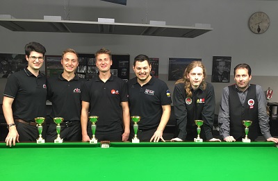...ABL1: 2. Werner Rieschl, 1. Martin Schmidt, 3. Emanuel Stegmeier... Im ABL1-Bewerb (ERGEBNISSE), der wie gewohnt in einer Round-Robin-Sechsergruppe ausgetragen wurde, gewann Martin seine fünf Partien und erzielte mit einer 75 auch das höchste Break des Tages. Werner Rieschl (HSEBC) musste sich nur Martin geschlagen geben und wurde mit vier Siegen Zweiter, Emanuel Stegmeier (ABC) mit drei Siegen Dritter.