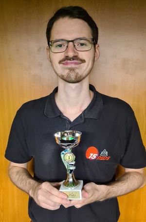 ...ASL-Challenge-Ost-1-Sieger Florian Toth... In Ost 1 unterlag Florian in der Gruppenphase zwar Bernhard Wallner 1:2, gewann dennoch vor Bernhard die Gruppe B, ließ im Halbfinale gegen Ömer Olgun (Snock) nichts anbrennen (2:0), und setzte sich in einem spannenden Endspiel hauchdünn gegen Carl Walter Steiner (HSEBC) durch: 3:2, wobei Carl Walter sich mit dem Turnier-Highbreak von 45 Punkten im vierten Frame in den Decider rettete, Florian diesen aber auch dank einer 21 für sich entschied. Platz 3 ging an Ömer, der Bernhard 2:1 besiegte.