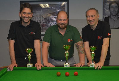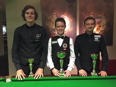 ...Grand Prix: 3. Oskar Charlesworth, 1. Florian Nüßle, 2. Andreas Ploner... Nach drei klaren Siegen und dem Verlust eines einzigen Frames startete Florian mit einer 46 ins Finale. Andreas konterte sofort mit einer 70 (1:1), ehe Florian den dritten Frame mit seiner 105 beendete. Das Century bringt ihm zusätzlich zur Highbreak-Prämie des ÖSBV 100 Euro der 15 Reds ein. Mit einer 73 erhöhte Florian auf 3:1, und nachdem Andreas das Finale nochmal spannend gemacht hatte (3:2), sicherte sich Florian mit einer 58 den Turniersieg. Im Spiel um Platz 3 setzte sich Oskar Charlesworth gegen seinen HSEBC-Vereinskollegen Philipp Koch denkbar knap mit 4:3 durch, und erzielte dabei Breaks von 42 und 54 Punkten. Die beiden 15-Reds-Teilnehmer, Thomas Janzso und Alexander Trinkl, mussten sich leider beide bereits in der ersten Runde klar mit 1:4 geschlagen geben: Thomas gegen Oskar Charlesworth, Alexander gegen Serbest Hussein (TSG). Florians Century war freilich das höchste Break des Turniers. Es wurden noch 11 weitere Breaks über 50 erzielt. Alle ERGEBNISSE sind in der ÖSBV-Online-Sportdirektion abrufbar. Die 15 Reds gratulieren herzlichst! Aktualisiert (Montag, den 19. Juni 2017 um 08:01 Uhr) ASL: Samstag Nennschluss für U21 in Graz & Masters in Innsbruck
