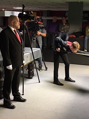 ...Florian Nüßle am Stoß; links referee Christian Fock... Im Finale gewann Florian 4 knappe Frames ohne hohe Breaks der beiden Spieler. Im Halbfinale gegen Manuel Pomwenger (Bulls) hatte Florian im Eröffnungsframe mit dem Turnier-Highbreak von 91 Punkten aufgezeigt, geriet dennoch mit 1:3 in Rückstand ehe er das Match noch kippen und mit 4:3 gewinnen konnte. Im anderen Halbfinale gewann Andreas gegen Oskar Charlesworth (HSEBC) glatt 4:0 und erzielte dabei Breaks von 43 und 58 in den letzten beiden Frames. Im Spiel um Platz 3 setzte sich Manuel mit 3:0 gegen Oskar durch. Die drei 15-Reds-Starter - Alexander Trinkl, Bernhard Wallner und Thomas Janzso - verpassten den Aufstieg aus ihren jeweiligen Gruppen, obwohl Alexander der einzige Spieler war, der an diesem Wochenende gegen Florian Nüßle gewinnen (3:2) konnte. Die kompletten ERGEBNISSE sind in der ÖSBV-Online-Sportdirektion abrufbar. Die 15 Reds gratulieren herzlichst! ACHTUNG: Der ORF hat vom Finaltag in der Grazer Snookerlounge Aufnahmen gemacht, die wie folgt im TV gezeigt werden: