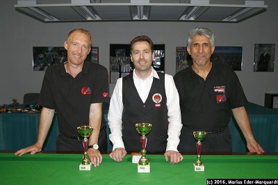 ...ASL Masters: Bernhard Müllner (2.), Christian Hochmayer (1.), Ebrahim Baghi (3)... Im Finale gewann Christian 3:2 gegen Bernhard, der nach einem 0:2-Rückstand noch auf 2:2 ausgleichen konnte ehe Christian mit einem 32er-Break im Decider das Match entscheid. Platz drei ging ebenfalls an die 15 Reds: Ebrahim Baghi besiegte Richard Kornberger (TSG) 2:0. Am zweitagigen Turnier nahmen insgesamt 29 Spieler(innen) teil. Für das höchste Break zeichnete unser 15-Reds-Mitglied Alexander Trinkl mit einer 55 verantwortlich. Alle ERGEBNISSE sind in der ÖSBV-Online-Sportdirektion abrufbar. In der RANGLISTE führt nach 5 von den 6 Turnussen Christian mit 430 Punkten vor Bernhard mit 342, Richard mit 278 und Ebrahim mit 268. Der 15 Reds gratulieren herzlichst! Aktualisiert (Freitag, den 01. Juli 2016 um 14:40 Uhr) |