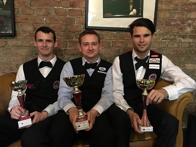 ...ASL Grand Prix: Dominik Scherübl (3.), Andreas Ploner (1.), Paul Schopf (2.)... Ploner gewann das Finale gegen Paul Schopf (PSCC) mit 4:1. Nach einem 1:1-Zwischenstand erzielte Schopf noch Breaks von 55 bzw. 56 Punkten, musste aber die jeweiligen Frames an Ploner lassen. Schopf (März) und Ploner (April) hatten bereits die beiden bisherigen Grand-Prix-Turniere dieser Saison gewonnen. In den Halbfinali hatte sich Ploner trotz 0:2-Rückstands mit 4:3 gegen Florian Nüßle (TSG) durchgesetzt, während Schopf aus einem 2:3-Rückstand gegen Dominik noch einen 4:3-Erfolg machen konnte. Dominik wurde nach einem 3:2 gegen Nüßle Dritter. Im dritten Frame des Halbfinales erzielte Dominik sein Century, das von den 15 Reds mit 100 Euro prämiert wird. Dominik erzielte dieses Wochenende nicht weniger als 10 Breaks über 40. Weiters waren auch ein 96er-Break von Ploner und eine 94er-Clearance von Markus Pfistermüller (1. UWBC) erwähnenswert. Die kompletten ERGEBNISSE sind in der ÖSBV-Online-Sportdirektion abrufbar. Es waren insgesamt 3 Clubmitglieder der 15 Reds am Start - Vladislav Arion und Thomas Janzso verpassten leider den Aufstieg aus der jeweiligen Gruppe. Die 15 Reds gratulieren herzlichst! |