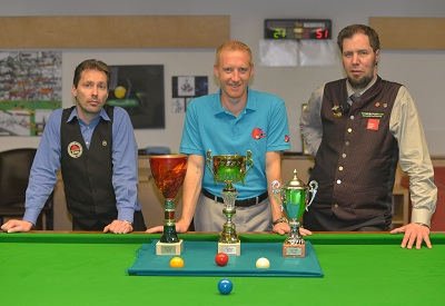 ...ASL Masters: Christian Hochmayer (2.), Bernhard Müllner (1.), Carl-Walter Steiner (3.)... Im Halbfinale gegen Carl-Walter Steiner (HSEBC) hatte sich Bernhard erst auf die letzte Schwarze im Decider mit 3:2 durchgesetzt. Steiner schließlich gewann das Spiel um Platz 3 gegen Michael Peyr (TSG) 2:1. 18 Spieler (darunter 5 15-Reds-Clubmitglieder) hatten genannt, einer konnte krankheitshalber nicht teilnehmen. Das höchste Break des Turniers gelang ebenfalls einem 15-Reds-Mitglied, Alexander Trinkl, mit einer 44. Alle ERGEBNISSE sind in der ÖSBV-Online-Sportdirektion abrufbar. In der MASTERS-RANGLISTE (PDF) hat nun Müllner die Führung übernommen. Hochmayer bleibt Zweiter, und Richard Kornberger (TSG) ist Dritter. Die 15 Reds gratulieren herzlichst! Clubabend: Clemens Kunkel gewinnt durch Konstanz