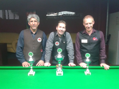 ...ASL Masters: 2. Ebrahim Baghi, 1. Christian Hochmayer, 3. Bernhard Müllner... Hochmayer besiegte im Finale unser Clubmitglied Ebrahim Baghi nach 1:1-Zwischenstand mit 3:1. Bernhard Müllner (15 Reds), der die ersten beiden Turniere gewann, wurde diesmal nach einem 2:0-Erfolg im kleinen Finale gegen Peter Köppl (Pot Black) Dritter. In der Rangliste führt nach wie vor Bernie vor Ebi. Im Semifinale hatte Ebi Bernie auf Schwarz im Decider geschlagen, während sich Hochmayer auch in einem Decider gegen Köppl durchsetzten konnte. Das höchste Turnierbreak erzielte ebenfalls ein 15-Reds-Mitglied - Alexander Trinkl mit einer 41er-Clearance. Am Turnier nahmen 22 Spieler(innen) teil. Die 15 Reds gratulieren herzlichst! ASL Masters: Ergebnisse [unter "Turniere"] | Rangliste Aktualisiert (Mittwoch, den 15. Juli 2015 um 09:18 Uhr) ASL: Raster für U21- und Masters-Turnier