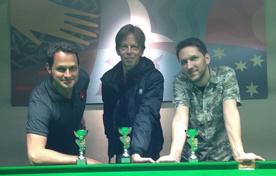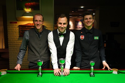 ...Challenge Ost im Köö 7 (v. l.): 2. Klaus Hickelsberger (BSVB), 1. Daniel Strobl (ISC), In der »neuen« Challenge Ost, die bei den 15 Reds im Köö 7 ausgetragen wurde, sicherte sich Daniel Strobl (ISC) vor Klaus Hickelsberger (BSBV Baden), der im ersten Turnus den Qualifier bei den 15 Reds gewonnen hatte, den Turniersieg. Hier wurde Patrick Stift (HSEBC) Dritter. Elias Kapitany (HSEBC) spielte mit einer 50 das höchste Break. Die 15 Reds gratulieren! Alle Ergebnisse sind in der Online Sportdirektion unter »Turniere« abrufbar. Der nächste Grand Prix findet am 25.-26. 4. beim CSC in Innsbruck 1. UWBC in Wels (Austragungsort wurde kurzfristig verlegt); die Challenge Ost am gleichen Wochenende beim HSEBC statt. Aktualisiert (Mittwoch, den 08. April 2015 um 18:21 Uhr) EBSA: Dominik Scherübl bei der U21-EM auf Malta