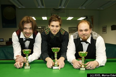 Die 15 Reds wünschen allen viel Erfolg! ASL Doubles Cup: Turnierraster & Spielreihenfolge ASL Challenge: Turniersiege in Ost an Emanuel Stegmeier und Alexander GaussDie Austrian Snooker League Challenge ist dieses Wochenende (14.-15. 2.) in die neue Saison 2015 gestartet, mit für die 15 Reds einem zweiten, einem dritten und zwei vierten Plätzen. In unserer Region Ost wurden zum letzten Mal 2 Turniere ausgetragen; ab der nächsten Runde gibt's nunmehr 1 Turnier, jedoch mit bis zu 20 Teilnehmer(inne)n. In Ost 1 (Sa-So: HSEBC) holte sich Emanuel Stegmeier (ABC) nach einem 3:2 gegen Philipp Koch (HSEBC) den Turniersieg, während Brian Perschl (HSEBC) vor unserem Clubmitglied Bernhard Wallner Dritter wurde.