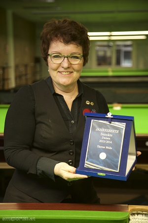 Toller Doppel-Erfolg für die 15 Reds! Die Österreichischen Snooker- (Staats-)Meisterschaften 2014 haben Samstag (31. 1.) beim 1. UWBC in Wels zwei Sieger(innen) hervorgebracht, die auch bereits jahresbeste(r) Spieler(in) in der jeweiligen ASL-Klasse geworden waren... und die auch beide 15-Reds-Clubmitglied sind: Therese Weihs wurde Staatsmeisterin bei den Damen, Dominik Scherübl gewann bei den U21.